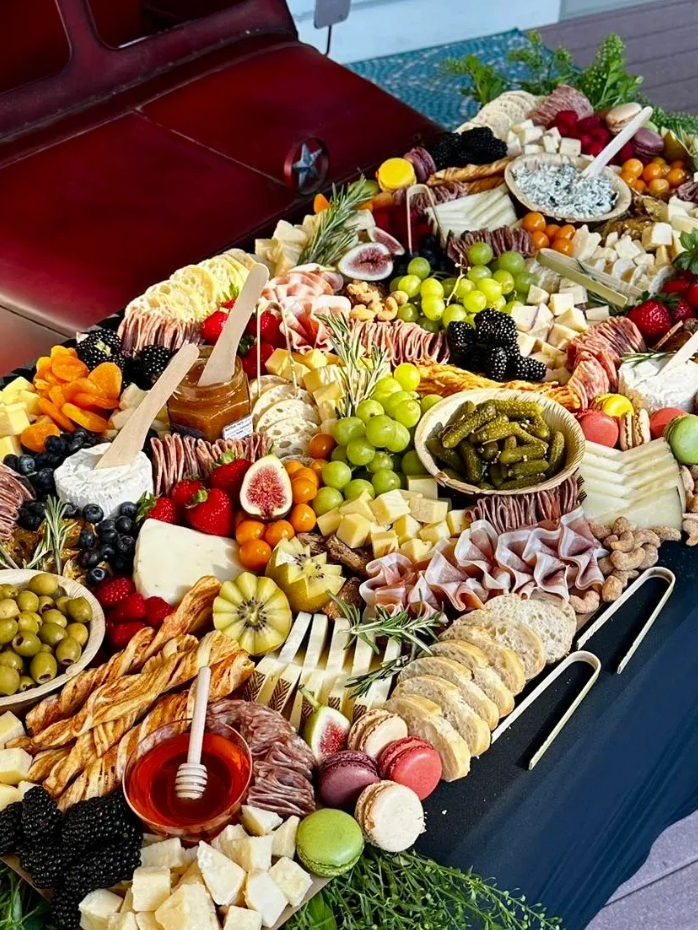 An elevated grazing experience designed to impress. This multi-level display features a collection of curated boards and platters, allowing you to customize your menu selection to perfectly suit your event. From brunch-inspired offerings to classic charcuterie favorites, each element is artfully arranged with greenery woven beneath elevated pieces, creating a lush, layered presentation that serves as both a dining experience and a stunning focal point.